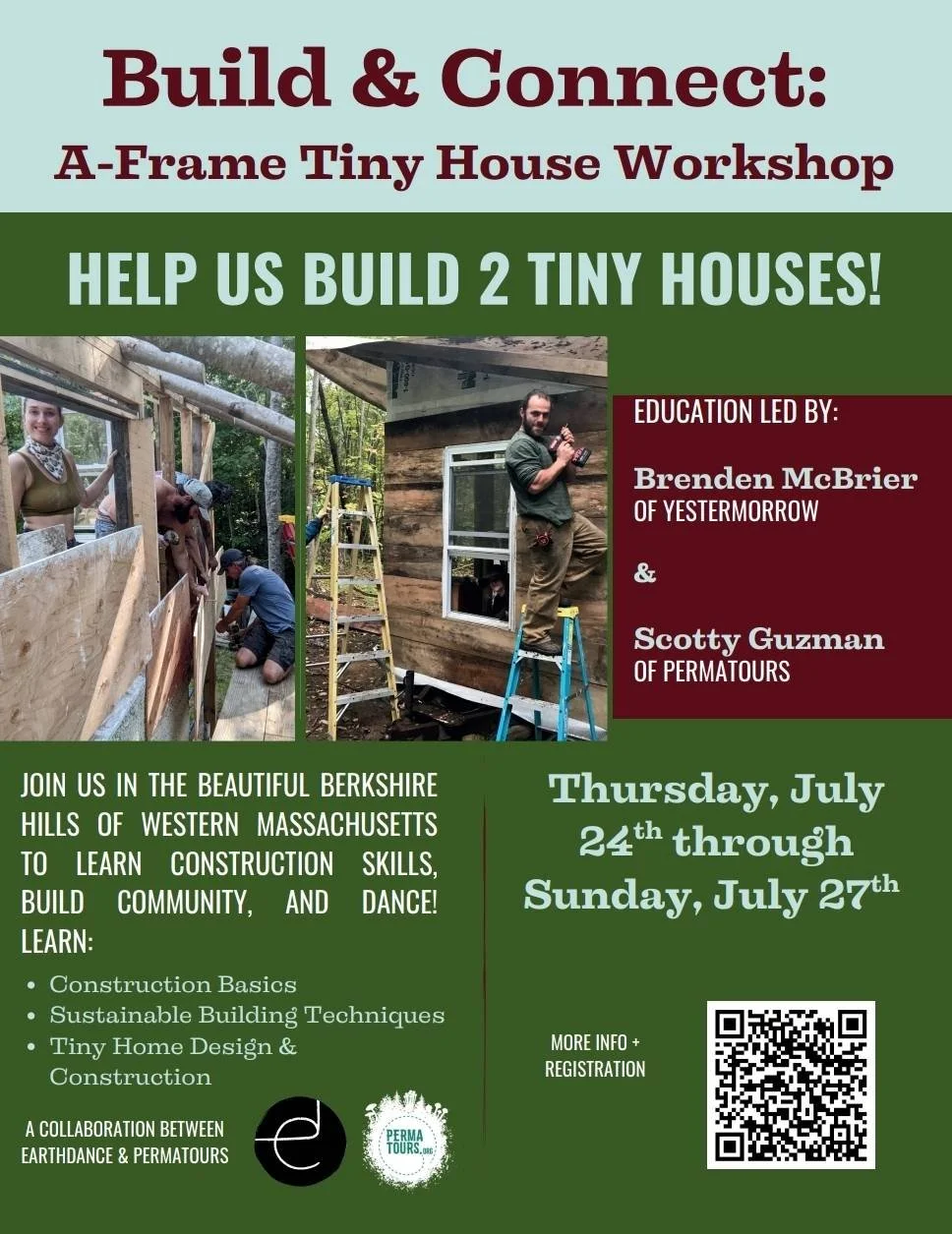 Join us in the beautiful Berkshire hills of Western Massachusetts to learn construction skills, build community, and dance!